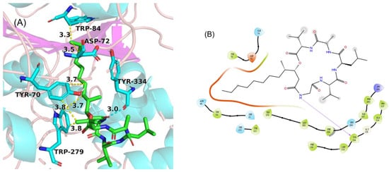 In order to gain an insight into the molecular interactions between compounds 1–5 and AChE, the crystal structure of the torpedo californica acetylcholinesterase enzyme (PDB ID: 2CMF) [] was used as the receptor, and it was subjected to an in silico molecular docking analysis with 1–5, using the induced-fit module in the Schrödinger software suite. As a result, compound 4 fit comfortably into the binding pocket for alkylene-linked tacrine dimers with similar binding positions. In the 2D binding model (Figure 6B), the alkyl chain of 4 formed hydrophobic interaction with the active-site residues TRP84, ASP72, TRY70, and TRP279, and the NH of Gly formed a hydrogen bond with the active site residue TYR334. Compounds 1–3 and 5 were not beneficial for binding to AChE.
