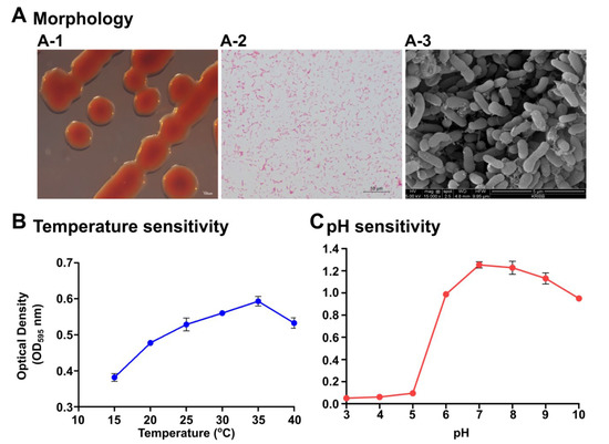 The temperature susceptibility of the isolate was conducted by determining the growth at various physiological temperatures. Briefly, 190 μL of marine broth was inoculated with 10 μL of an overnight culture of bacteria that contained 3.8 × 108 CFU/mL in 96-well plates. Bacterial suspensions were incubated at 15, 20, 25, 30, and 35 °C. The growth of the bacteria was measured at 0, 4, 8, 12, 20, and 24 h by determining the absorbance (MarkTM, Bio-Rad Saint Louis, MO, USA) at 595 nm (OD595) after thoroughly mixing the culture. The absorbance at the 24 h time point was compared and presented. The pH-dependent growth tolerance was tested by culturing the P. xiamenensis in marine broth at a pH ranging from 3 to 10 at 30 °C for 24 h in a shaker (180 rpm). Bacterial growth was determined by measuring the OD595 at 0, 4, 8, 12, 20, and 24 h. The absorbance at the 24 h time point was compared.