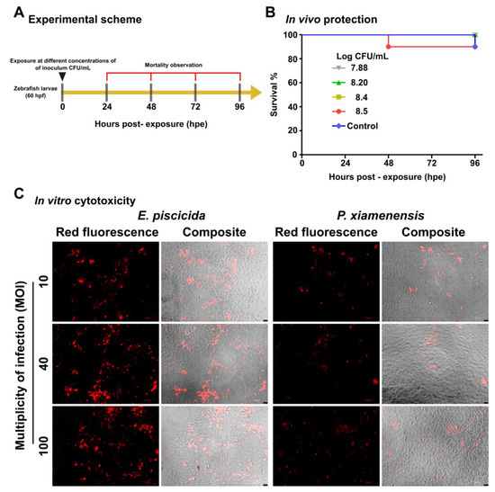Safety assessments of the probiotic isolate, P. xiamenensis, and pathogenic strain, E. piscicida. In vivo safety assessment was conducted by exposing zebrafish larvae to different concentrations of P. xiamenensis in egg water. (A) Schematic representation for the experimental schedule of P. xiamenensis exposure to the zebrafish larvae. (B) Kaplan−Meier survival curves of zebrafish larvae upon exposure to the different concentrations of P. xiamenensis. (C) In vitro cytotoxicity assay. Fathead minnow (FHM) fish epithelial cells were either exposed to P. xiamenensis probiotic isolate, or E. piscicida pathogenic strain. After 1 h of incubation, cells were washed with PBS and non-internalized bacteria were eliminated by gentamycin treatment. The cells were replenished with complete growth media and further incubated for 12 h. After 12 h incubation, the cells were subjected to propidium iodide (PI) staining and observed under a fluorescent microscope. Images were taken at 200 × magnification.