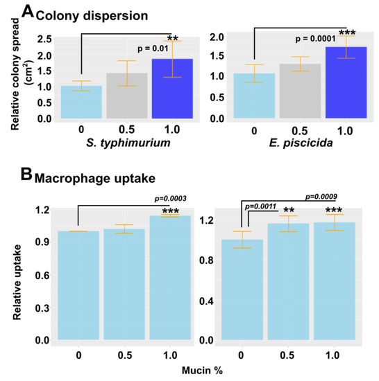 Mucin is a frontline defense barrier in the innate immune system. Due to significant changes in the mucin gene expression induced by P. xiamenensis treatment, we hypothesized that there could be a potential link between this and pathogen resistance. To assess the effect of mucin on bacterial colony formation, we used motile bacteria E. piscicida and Salmonella enterica serovar typhimurium (Figure 5). Commerciallyavailable porcine mucin was added to a 0.8% soft agar medium at variable concentrations (0, 0.5, or 1.0%). Mid-log phase E. pscicida and S. typhimurium were dotted on solidified agar and incubated overnight. The next day, the colony diameters were measured, and we observed the dispersion of colony size, possibly due to the prevention of tight biofilm formation. This demonstrated the mucin’s ability to dissolve biofilms as a defense strategy against pathogenic bacteria. With an increase in mucin concentration, a higher level of colony dispersion was observed, resulting in larger colonies (Figure 5A). The effect of mucin on macrophage uptake was also investigated by incorporating porcine mucin into the cell culture media in which murine macrophage RAW264.7 cells were grown. Cell medium was supplemented with 0, 0.5, or 1.0% porcine mucin, and the E. piscicida and S. typhimurium bacteria were inoculated at a multiplicity of infection (MOI) of 40. After 1 h of incubation, the cells were washed with gentamycin to eliminate bacteria in the surrounding media, and the number of bacteria taken up by macrophage cells was quantified by plating on agar with serial dilutions. A significant increase in macrophage uptake was evident when 1.0% mucin was added to the agar, suggesting that mucin may increase macrophage uptake, and may potentially enhance antigen presentation against invasive bacteria (Figure 5B).