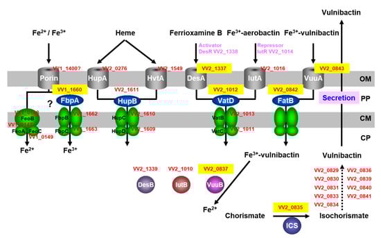 Schematic representation of the predicted iron-utilization systems in Vibrio vulnificus M2799. Proteins identified in PMF analysis are shown in yellow boxes. V. vulnificus CMCP6 protein numbers are shown in red letters. OP, outer membrane; PP, periplasmic space; CM, cytoplasmic membrane; CP, cytoplasm.