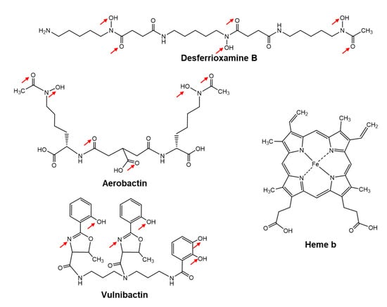 Specific iron chelators utilized by Vibrio vulnificus M2799. The metal ligands in the structures of the various siderophores are shown by the red arrows.