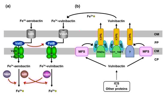 - Okai, N.; Miyamoto, K.; Tomoo, K.; Tsuchiya, T.; Komano, J.; Tanabe, T.; Funahashi, T.; Tsujibo, H. VuuB and IutB reduce ferric-vulnibactin in Vibrio vulnificus M2799. BioMetals 2020, 33, 187–200. [Google Scholar] [CrossRef] [PubMed]