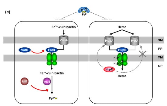 Heme is also a potential iron source in humans, but siderophores cannot remove iron from heme, hemin, or hemoproteins due to the iron binding affinity []. However, V. vulnificus can directly incorporate iron from free heme via its heme receptors []. We identified the heme-acquisition system in V. vulnificus M2799, with growth experiments of deletion mutants indicating that HupA and HvtA are major and minor heme receptors, respectively (Figure 3c) []. While VuuA is the sole receptor in the ferric-vulnibactin utilization system, HupA and HvtA function as heme receptors. Heme in the periplasm is captured by a PBP (HupB) and transported through the inner membrane by an ABC transporter (HupCD) (Figure 3c) []. Unlike FatB in the ferric-vulnibactin utilization system, HupB plays an essential role in the heme-acquisition system. hupR is located upstream of hupA in the opposite orientation and HupR is classified as a LysR-type positive regulator. qRT-PCR analysis using ΔhupR indicated that hupA expression, but not that of hvtA, is positively regulated by HupR []. Further studies showed that hupA, hvtA and hupBCD are negatively regulated by Fur (Figure 3c) []. Heme-utilization systems of human pathogens may be targets for antimicrobial agent and we propose HupB as a new target because of its high similarity with PBPs of other pathogens. Alice et al. first reported that V. vulnificus CMCP6 had three copies of the genes coding for TonB system and the importance of TonB12 systems in ferric-siderophore transport and the pathogenesis []. In many Vibrio species including V. vulnificus M2799, the tonB1-exbB1-exbD1 genes were part of hupBCD genes, suggesting that the system plays a key role in the pathogenesis []. The amino acid sequence of HupA from V. vulnificus M2799 was showed 30% and 90% identities to the corresponding proteins from V. vulnificus CMCP6 (L1) and ATCC27562T (L2), respectively []. Therefore, strain M2799 might be classified as L2 into V. vulnificus phylogenetic lineages []. The genome analysis of strain M2799 and the relationship between the phylogenetic lineages and the pathogenesis remains to be clarified.