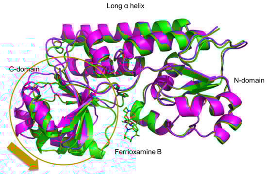 Superimposition of ferrioxamine B complex (green) and apo (magenta) forms of VatD. Ferrioxamine B is depicted as a stick model.