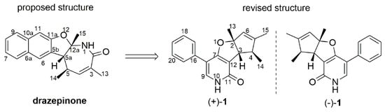 Without the assistance of single-crystal X-ray diffraction analysis, many complex natural products that exhibited important biological activities and played a major role in drug discovery were assigned to erroneous structures or could not be unambiguously established [1]. Drazepinone (a previously proposed structure as a trisubstituted tetrahydronaphthofuroazepinone core; Figure 1), a specialized metabolite that is a type of alkaloid, was obtained for the first time in 2005 from a pathogenic fungal strain of Drechslera siccans from seeds of Lolium perenne [2]. In biological activity studies, drazepinone has been proved to have broad-spectrum herbicidal properties with low zootoxic activity at a concentration of 2.0 μg/μL, suggesting that it could be applied as an environmentally friendly and safe herbicide [2]. During the course of our ongoing research on bioactive natural products from marine-derived fungi [3,4], an extract of the fungal strain Penicillium sumatrense (Trichocomaceae) showed inhibitory activity against protein tyrosine phosphatase (PTP). Our chemical investigations of this fungus using a bioassay-guided method led to the isolation of compounds (+)-1 and (−)-1, comprising a racemate with identical 1D NMR data to drazepinone. However, we found that some 2D NMR data of drazepinone (1H-1H COSY and key HMBC) were incorrectly interpreted, prompting us to carefully analyze the NMR spectroscopic data of (+)-1 and (−)-1, and to revise the structure of drazepinone (Figure 1).