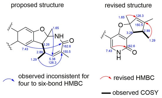 Observed inconsistent and revised 2D NMR data of drazepinone.