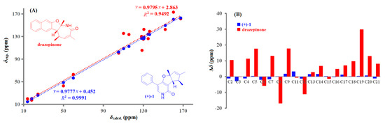 Regression analysis (A) and individual deviations (B) of experimental versus calculated 13C NMR chemical shifts of drazepinone and (+)-1.