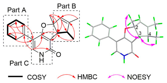 According to the 1D and 2D NMR data (Figures S1–S13), it could be deduced that (±)-1 consisted of three units, phenyl group (Part A), trimethylcyclopent (Part B), and furopyridone (Part C) (Figure 4). The key HMBC correlations from H-17/19 to C-8, and from H-9 to C-16 suggested the C-C bond between C-8 and C-16. Moreover, the connectivity between oarts B and C was established by the key HMBC correlations from H-3 to C-7 and C-12. Thus, the planar structures of (+)-1 and (−)-1 were established, with a 6-6/5/5 ring system. Importantly, in the revised structures of (+)-1 and (−)-1, the HMBC correlations from δH 7.43 to δC 162.6, from δH 1.29 to δC 150.5, and from δH 1.65 to δC 126.3, all of which were three-bond correlations, and the absence of COSY correlation between δH 2.89 and δH 5.53, could be taken into consideration perfectly (Figure 2). Furthermore, GIAO 13C NMR calculation was also performed for the revised structure (+)-1 at the same level as that for the proposed structure of drazepinone. As shown in Figure 3, the max individual deviation (|Δδ|) between the experimental and calculated chemical shifts was 3.1 ppm for (+)-1. Additionally, the high correlation coefficient (R2 = 0.9991) for (+)-1 (Figure 3), indicating that the δC of (+)-1 matched the calculated δC very well, which confirmed the framework of the revised structure of (+)-1. Detailed analysis of 13C NMR data of (+)-1 and (−)-1, it was strangely found that the chemical shift of C-2 with value of δC 102.2 (DMSO-d6)/105.3 (CD3OD)/103.9 (CDCl3) were much lower than what was expected, and the 13C NMR chemical shift calculation of (+)-1 showed that this phenomenon was entirely possible, which was caused by a combination of oxygen and double bond. Subsequently, NOESY correlations from H-3 (δH 3.08) to H3-13 (δH 1.58) and H3-14 (δH 1.17) (Figure S13) indicated that all of these protons should be placed on the same side of the molecule (Figure 4).