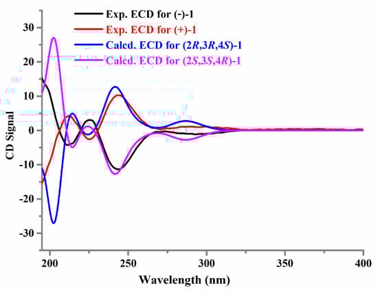 Determination of the absolute configurations by the ECD method combined with quantum-mechanical calculations [8,9] was carried out for (+)-1 and (−)-1. Based on the relative configuration of (+)-1 and (−)-1, molecules (2R,3R,4S)-1 and (2S,3S,4R)-1 were chosen for conformational searches, structural optimizations, and time-dependent density functional theory (TD-DFT) ECD calculations. As shown in Figure 5, the experimental ECD spectra of (+)-1 and (−)-1 had good agreement with the calculated ECD spectra of (2R,3R,4S)-1 and (2S,3S,4R)-1, respectively. Thus, the absolute configurations of (+)-1 and (−)-1 were assigned as 2R,3R,4S and 2S,3S,4R, respectively. Furthermore, the proposed structure of drazepinone was also used for TD-DFT ECD calculation. The calculated results showed that neither the experimental ECD spectrum of (+)-1 nor (−)-1 matched well with the calculated ECD spectrum of the proposed structure of drazepinone (Figure S15), confirming our structural revision.