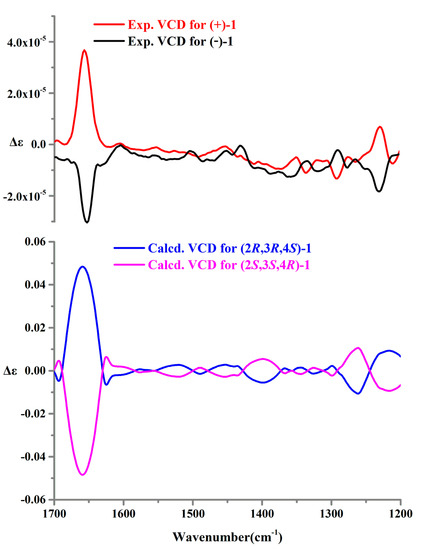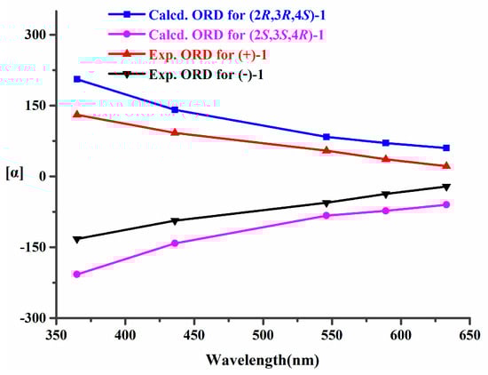 Recently, in addition to ECD, other chiroptical techniques, such as VCD and ORD, have also been commonly employed to assign the absolute configurations of some previously undescribed natural products, especially using a combined analysis of ECD, VCD, and ORD properties [10,11,12,13]. Thus, we tried to further confirm the absolute configurations of (+)-1 and (−)-1 by using VCD and ORD. Firstly, the experimental VCD spectra in DMSO-d6 of (+)-1 and (−)-1 were carried out at a resolution of 4 cm−1, and the experimental ORD data for (+)-1 and (−)-1 at five wavelengths (365, 436, 546, 589, and 633 nm) were recorded in CH3OH. Then, the calculation of VCD and ORD spectra for (2R,3R,4S)-1 and (2S,3S,4R)-1 were carried out. Finally, the experimental VCD and ORD data of (+)-1 and (−)-1 were combined for analysis with their corresponding theoretical predictions (Figure 6 and Figure 7). The results verified that the absolute configurations of (+)-1 and (−)-1 were unambiguously assigned as 2R,3R,4S and 2S,3S,4R, respectively.
