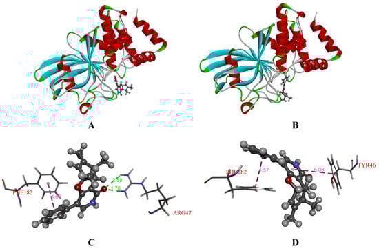 (A) Docked ligands [(−)-1] in the binding pocket of TCPTP (PDB: 2FJM); (B) docked ligands [(+)-1] in the binding pocket of TCPTP (PDB: 2FJM); (C) interactions between (−)-1 and TCPTP (PDB: 2FJM); (D) interactions between (+)-1 and TCPTP (PDB: 2FJM). The H-bonds were shown in green. The π-π interaction were shown in pink.