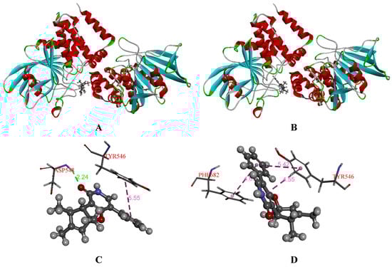 To further explore the difference in inhibitory effects between (+)-1 and (−)-1 against PTP1B and TCPTP, the molecules (2R,3R,4S)-1 and (2S,3S,4R)-1 were selected to investigate the binding mode using molecular docking. The conformations of ligands in the binding pocket of PTP1B and TCPTP were shown in Figure 8 and Figure 9. The docked conformation of (−)-1 was found to tightly bind to the entire active pocket of PTP1B or TCPTP. Docking results implied that (−)-1 binds deep in the active site pocket and forms H-bonds with the ARG47 of PTP1B (Figure 8C), while, interestingly, there was no H-bond to stabilize (+)-1 in PTP1B (Figure 8D). Similarly, H-bonds were found between (−)-1 and residue ASP548 in TCPTP (Figure 9C), but not for (+)-1 in TCPTP (Figure 9D). Therefore, H-bonds could make the interaction between (−)-1 and PTP1B/TCPTP stronger than that between (+)-1 and PTP1B/TCPTP.