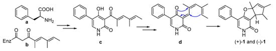 Hypothetical biosynthetic pathways for (+)-1 and (−)-1.