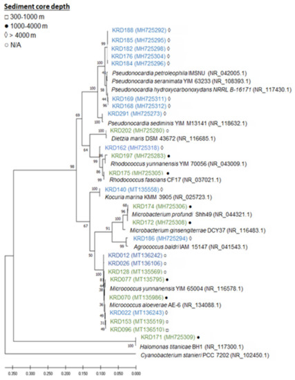 Twenty-five strains, 14 Antarctic and 11 Arctic, were selected from a larger collection of Polar marine sediment bacteria mainly consisting of Actinobacteria [11], based on taxonomy, isolation location (depths ranging from 388 to 4730 m) and previously known metabolic profile of the strains. The selected strains belonged to seven rare actinomycete genera—Pseudonocardia (eight strains), Micrococcus (seven strains), Rhodococcus (three strains), Microbacterium (three strains), Kocuria (one strain), Agrococcus (one strain), Dietzia (one strain). This genus-level delineation was well supported with bootstrap values over 67% and all strains clade with their respective reference sequences. Additionally, one strain of the phylum Proteobacteria, belonging to the Halomonas genus, was included in the study (Figure 1, Table S1). In terms of core depth (Figure 1), the two Agrococcus, one Kocuria and the eight Pseudonocardia strains were only isolated from the deepest sediment cores at a depth greater than 4000 m, and the one Halomonas and the two Microbacterium strains were only isolated from core depths of 1000–4000 m, while no pattern was observed for the genera Micrococcus and Rhodococcus. Although these observations are interesting, larger strain numbers would be required to draw statistical conclusions.