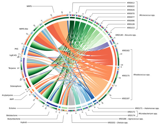 Genome mining of the seventeen Polar rare Actinobacteria and the Proteobacteria (Pseudonocardia strains excluded) revealed a total of 133 BGCs including NRPS, PKS, terpene and RiPP classes. Interestingly, 37% of the total BGCs showed no homology to any BGC within the MiBIG database and a further 30% suggested homology ranging from 2% to 63% to known antibiotics. The biosynthetic diversity per strain is shown in the Circos diagram (Figure 2). The width of the bands indicates the number of BGCs within each Natural Product (NP) class which, as expected, is positively correlated to genome size. The lowest number of BGCs was observed for small genomes such as the Micrococcus (2.4–2.7 Mbp) and Agrococcus (3.1 Mbp) both of which had five BGCs, whereas the three Rhodococcus strains (5.4–6.7 Mbp) revealed the largest number (17–22) of BGCs. Moreover, strains belonging to the same genus showed BGCs of the same NP class (Table S3). The ectoine pathway was observed in almost all genomes except the Kocuria (KRD140) and the Microbacterium (KRD174) strains. A similar pattern was observed for the terpene BGC which was present in the genome of all Polar isolates except the Halomonas strain (KRD171) (Table S3). The most abundant NP class was NRPSs which were not evenly distributed among all strains, as the smaller genomes such as Micrococcus and Microbacterium did not show any NRPS BGCs, although at least one NRPS-like fragment was identified in their genomes. On the other hand, larger genomes such as the Rhodococcus strains revealed a high number of NRPS BGCs (up to 10). Identification of siderophores based on bioinformatic analysis can often be challenging as many siderophores are produced through NRPS pathways, thus antiSMASH identifies them as NRPS and not siderophores [8,43]. Indeed, antiSMASH identified two NRPS clusters in one Halomonas strain (KRD 171) and one Rhodococcus strain (KRD 197) that have 53% and 63% gene homology to the serobactin and heterobactin siderophore pathways, respectively. Only 10 BGCs belonging to the PKS family were observed, of these, five were identified as Type I PKS, one Type II PKS, three Type III PKS, and one heterocyst glycolipid synthase-like PKS (hgIE-KS).