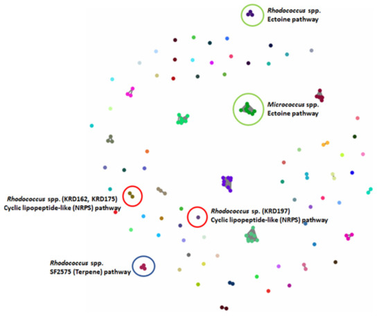 BiG-SCAPE analysis of 17 strains. The 133 BGCs; 53 NRPS/NRPS-like, 20 Terpene, 10 PKS, 3 RiPP and 47 others (including BGCs such as ectoine, siderophore, betalactone) were clustered in 80 GCFs. Examples of GCFs of interest are highlighted in coloured circles; red represents the Rhodococcus spp. NRPS BGC corresponding to a potentially new cyclic lipopeptide, green represents the ectoine pathway found in all strains (here highlighted for the Micrococcus and Microbacterium spp.) and blue the terpene BGC found in all three Rhodococcus strains with low homology to the known antibiotic SF2575.