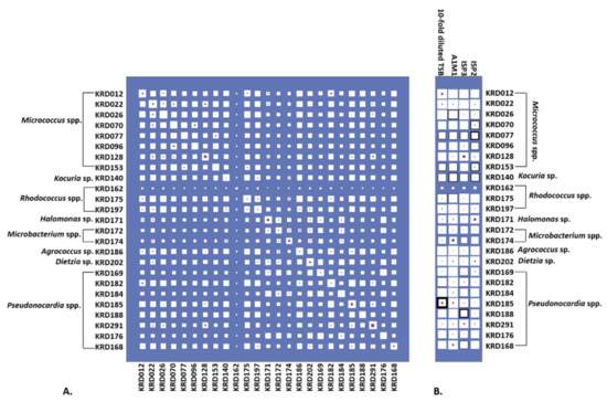 Culturing all strains in four growth media resulted in 100 metabolite extracts, of which 72% exhibited activity against six pathogenic bacteria (Escherichia coli, Staphylococcus aureus, Klebsiella pneumoniae, Acinetobacter baumanii, Pseudomonas aeruginosa and Enterococcus faecalis) known as the “ESKAPE” pathogens [48]. Specifically, 39% of the biologically active strains (28% of the total number) showed antibacterial activity against only one pathogen. The same percentage of active extracts inhibited the growth of one or more pathogens under only one cultivation condition. The inhibition zones ranged from 0.1 to 2.1 cm (Table S4). Most of the bacterial metabolite extracts were active against S. aureus with the Pseudonocardia strain KRD185 showing the largest inhibition zone (2.1 cm). Moreover, the 10-fold diluted TSB extract of strain KRD185 showed promising antibacterial activity against K. pneumoniae (0.9 cm) and A. baumannii (1.5 cm), whereas the A1M1 and 10-fold diluted TSB extracts of Rhodococcus strain KRD175 were selectively active against K. pneumoniae (Table S4). The occurrence of parent ions in relation to the bioactive extract is shown in Figure 4 where Hinton diagrams are illustrating the number of parent ions produced only by each strain (strain specific), as well as shared between two strains (Figure 4A). Strains belonging to the same genus shared the highest number of produced parent ions, which of course varies between the genera. For example, within the Micrococcus genus, strains KRD022 and KRD026 share the highest number of parent ions (649 in total), whereas strains KRD128 and KRD096 share only 287 parent ions. For the Pseudonocardia spp. isolates, there is a wide variation in the number of shared parent ions (163–632), where strain KRD176 shares 632 ions with KRD196 and only 163 with KRD291. Variations ranging from 104 to 649 shared parent ions also occurred between strains of different genera, as expected. The Microbacterium sp. strain KRD174 shared 104 and 123 parent ions with Micrococcus sp. KRD096 and Pseudonocardia sp. KRD291, respectively, representing the lowest number of shared ions. On the other hand, the Rhodococcus strain KRD175 showed the largest number of shared parent ions (649) with strain KRD022 of the Micrococcus genus. The sole Kocuria sp. isolate, KRD140, shared only 199 parent ions with Pseudonocardia strain KRD176, but shared more than 400 ions with three Pseudonocardia strains (KRD182, KRD185, KRD188). Amongst the Pseudonocardia strains, KRD182 showed the highest number of shared parent ions with Micrococcus spp. (356–607 parent ions), and Rhodococcus strains (465–612 parent ions). The Hinton diagram in Figure 4B demonstrates the number of parent ions produced by strains under each growth condition (white box), as well as the number of specific parent ions per strain grown under each growth condition (purple box) and the observed bioactivity (black outline). The 10-fold diluted TSB metabolite extract of KRD185 (Pseudonocardia sp.) had the highest bioactivity, with a zone of inhibition of 2.1 cm, and it produced the highest number of total (803) and unique (29) parent ions in that growth condition when compared to the rest of the studied isolates. Although the Micrococcus strain KRD022 produced the highest numbers of parent ions in ISP2 (819) and A1M1 (864) media, it did not exhibit any biological activity against the pathogenic bacteria. These two examples indicate that bioactivity is not necessarily related to the highest number of produced metabolites (parent ions).