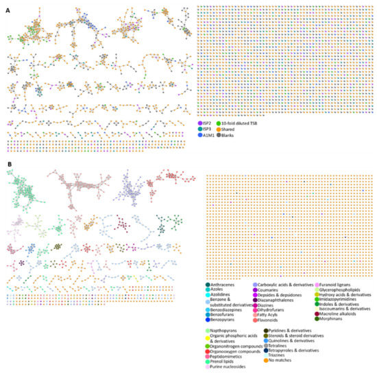 To enhance chemical structural information within the molecular network, information from in silico structure annotations from GNPS Library Search and Network Annotation Propagation (NAP) were incorporated into the network using the GNPS MolNetEnhancer workflow (https://ccms-ucsd.github.io/GNPSDocumentation/molnetenhancer/ (accessed on 9 November 2020)) on the GNPS website [31]. Chemical class annotations were performed using the ClassyFire chemical ontology [85]. (https://gnps.ucsd.edu/ProteoSAFe/status.jsp?task=adbadc0707e7449dbe4de1562ecd7bd3 (accessed on 9 November 2020)).