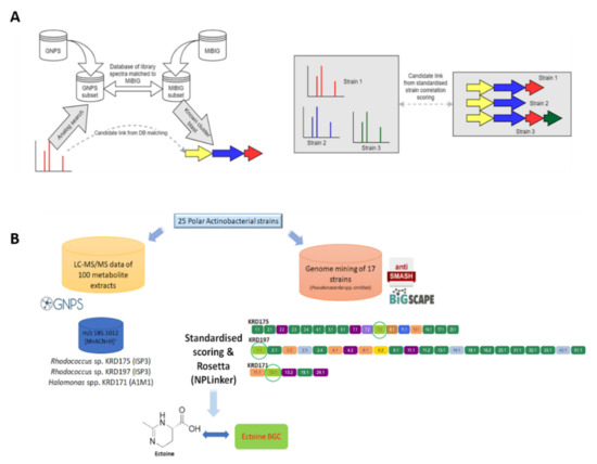 - Van Der Hooft, J.J.J.; Mohimani, H.; Bauermeister, A.; Dorrestein, P.C.; Duncan, K.R.; Medema, M.H. Linking Genomics and Metabolomics to Chart Specialized Metabolic Diversity. Chem. Soc. Rev. 2020, 49, 3297–3314. [Google Scholar] [CrossRef]