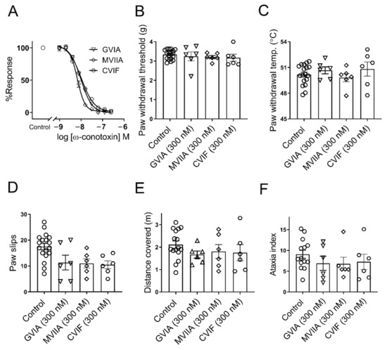 The effects of intraplantar administration of ω-conotoxins on locomotor activity were tested by measuring the number of paw slips, and the distance covered over 2 min at 1 h after the administration of a 6 pmol/paw (300 nM; 20 µL) dose of GVIA, MVIIA, and CVIF (i.pl.) (Figure 1D–E). The number of paw slips of GVIA, MVIIA, and CVIF treated mice were not significantly different compared to vehicle treated mice (300 nM GVIA, 11.3 ± 2.8; 300 nM MVIIA, 11.0 ± 1.8 g; 300 nM CVIF, 10.5 ± 1.5 g; vehicle control, 17.0 ± 1.5 g; p > 0.05; Figure 1D). The distances covered by GVIA, MVIIA, and CVIF treated mice were also not significantly different compared to vehicle treated mice (300 nM GVIA, 1.7 ± 0.2 m; 300 nM MVIIA, 1.8 ± 0.3 m; 300 nM CVIF, 1.7 ± 0.4 m; vehicle control, 2.1 ± 0.2 m; p > 0.05; Figure 1E). No significant change in ataxia index (paw slips/distance covered) was observed between GVIA, MVIIA, and CVIF treated mice compared to vehicle treated mice (300 nM GVIA, 6.9 ± 1.7 m; 300 nM MVIIA, 6.7 ± 1.6 m; 300 nM CVIF, 7.3 ± 1.8 m; vehicle control, 9.1 ± 0.1 m; p > 0.05; Figure 1F). The data of the locomotor side effects of ω-conotoxins are summarized in Supplementary Tables S3–S5.