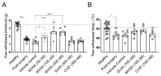 Surgery also caused small but significant thermal allodynia in mice, with the PWTs to thermal stimulation of mice with incised paws being significantly lower compared to naïve mice, 24 h after surgery (naïve, 50.2 ± 0.3 °C; post-surgery, 48.7 °C ± 0.4 g; p < 0.05; Figure 2B). However, none of the ω-conotoxins effectively reduced thermal allodynia when administered via intraplantar injection in a dose of 2 pmol/paw (100 nM; 20 µL) compared to control mice (100 nM GVIA, 49.5 ± 0.5 °C; 100 nM MVIIA, 49.8 ± 0.3 °C; 100 nM CVIF, 48.9 ± 0.4 °C; vehicle control, 48.7 ± 0.4 °C; p > 0.05; Figure 2B). The data of surgery-induced mechanical and thermal allodynia are summarized in Supplementary Tables S6 and S7.