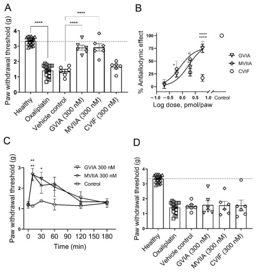 We assessed the antiallodynic effects of intraplantar injection of ω-conotoxin GVIA, MVIIA, and CVIF on oxaliplatin-induced mechanical allodynia (Figure 3A–D). Administration of 6 pmol/paw (300 nM; 20 µL) GVIA and MVIIA (i.pl.) led to a reversal of mechanical allodynia, which was significantly higher than vehicle control mice (300 nM GVIA, 2.9 ± 0.2 g; 300 nM MVIIA, 2.9 ± 0.2 g; vehicle control, 1.4 ± 0.1 g; p < 0.0001; Figure 3A) but not different from naïve mice (naïve, 3.3 ± 0.1 g; p > 0.05; Figure 3A). On the contrary, 6 pmol/paw (300 nM; 20 µL) CVIF (i.pl.) did not elicit significant antiallodynic effect compared to vehicle control (300 nM CVIF, 1.7 ± 0.1 g; vehicle control, 1.4 ± 0.1 g; p > 0.05; Figure 3A).