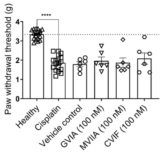 We assessed the analgesic effects of intraplantar injection of 2 pmol/paw (100 nM, 20 µL) GVIA, MVIIA, and CVIF against cisplatin-induced mechanical allodynia (Figure 4). Administration of 100 nM MVIIA, GVIA, and CVIF did not produce any significant antiallodynic effect compared to vehicle control (100 nM GVIA, 2.0 ± 0.2 g; 100 nM MVIIA, 1.9 ± 0.2 g; 100 nM CVIF, 2.0 ± 0.3 g; vehicle control, 1.8 ± 0.2 g; p > 0.05; Figure 4).