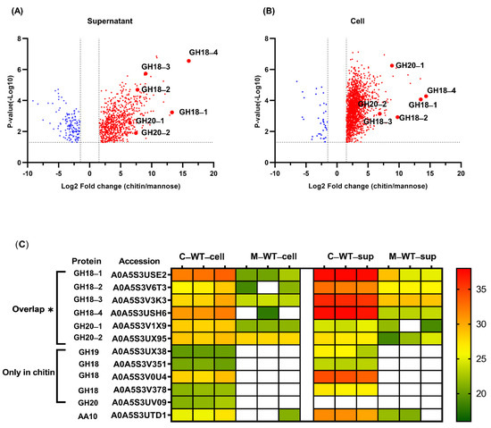Comparison of identified proteins in the culture supernatant (A) and cells (B) of Pseudoalteromonas rubra S4059 when grown on chitin compared to on mannose. The dotted lines indicated that a threshold value for the cut off was a combination of p-value ≤ 0.05 and Log2 fold-change ≥ 1.5. Red dots represent upregulated proteins, and blue dots represent downregulated proteins. Chitinolytic enzymes with significant fold changes are highlighted by enlarged dots with protein names in (A,B). Heat map comparison of identified chitinolytic enzymes in the supernatant and cells of Pseudoalteromonas rubra S4059 is color-coded by increasing abundance (C). C–WT–cell: cells of S4059 grown on chitin; M–WT–cell: cells of S4059 grown on mannose; C–WT–sup: culture supernatant of S4059 grown on chitin; M–WT–sup: culture supernatant of S4059 grown on mannose. White denotes proteins not detected under this condition. ‘Overlap’ indicates these proteins were detected in both chitin and mannose-grown samples, and an asterisk (*) highlights proteins significantly upregulated when grown on chitin compared to on mannose.
