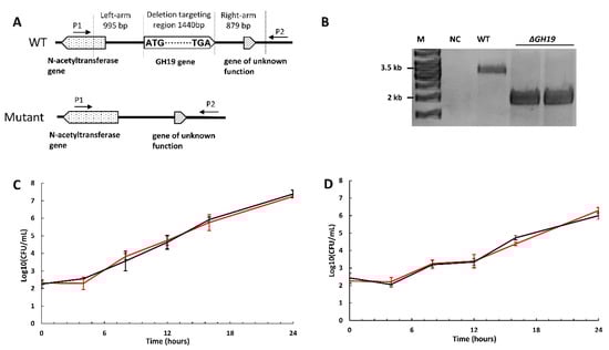The in-frame deletion of the GH19 chitinase gene in Pseudoalteromonas rubra S4059 was verified by PCR with primers P1 and P2 that target the left and right homology arm of the GH19 chitinase gene (A). The PCR products were analyzed by electrophoresis (B). M: DNA ladder; NC: negative control with water as the PCR template; WT: PCR products with gDNA of wild type strain S4059 as a template; ΔGH19: PCR products with gDNA of ΔGH19 as a template. Growth kinetics of Pseudoalteromonas rubra S4059 wild type (red lines) and ΔGH19 (black lines) when grown in a marine minimal medium containing (C) colloidal chitin or (D) crystalline chitin (shrimp chitin) without casamino acids at 25 °C for 24 h, shaking at 200 rpm. Data were analyzed on three biological replicates, and the error bars represent the standard deviation.