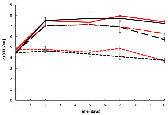 Growth and attachment of Pseudoalteromonas rubra S4059 wild type (red) and mutant ∆GH19 (black) on Vannamei shrimp shells. Long dash lines: samples from liquid surrounding shrimp shells before sonication. Solid lines: samples from liquid surrounding shrimp shells after sonication. Short dash lines: samples from 3% Sigma sea salt without shrimp shells as a control. Data were analyzed on three biological replicates, and the error bars represent standard deviation.