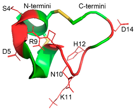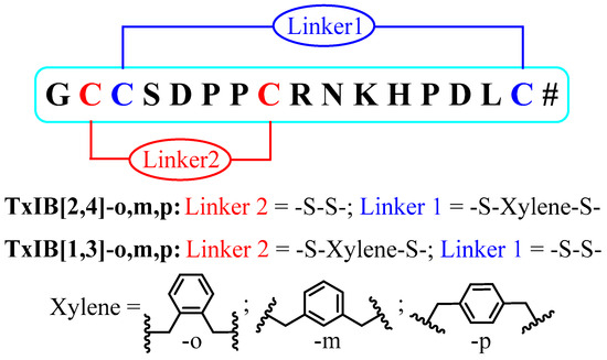 Most of the previous work on disulfide bond modifications are disulfide bond substitutions. These methods can better maintain the active conformation of polypeptides. Moreover, the introduction of unnatural amino acids and catalysts does not have advantages in synthetic cost and technical difficulty [23]. TxIB contains almost all amino acid residues with reactive side chains, like Ser, Asp, Arg, Asn, Lys and His (Figure 8), which makes selective chemical modification a challenge. This study is based on the direct modification of natural linear peptides with cysteine residues. Specifically, three kinds of xylene (o-, m- and p-) were inserted into the disulfide bond at cysteine [1,3] or cysteine [2,4] one at a time to obtain six peptidomimetics. The experimental results showed that the reaction can be scaled up smoothly and obtain the folded peptides with much higher isolated yields (55% to 65%) than are otherwise currently available. In other words, the yield was increased by four times compared to the traditional method. In general, the method is simple and feasible with low cost and high yield.