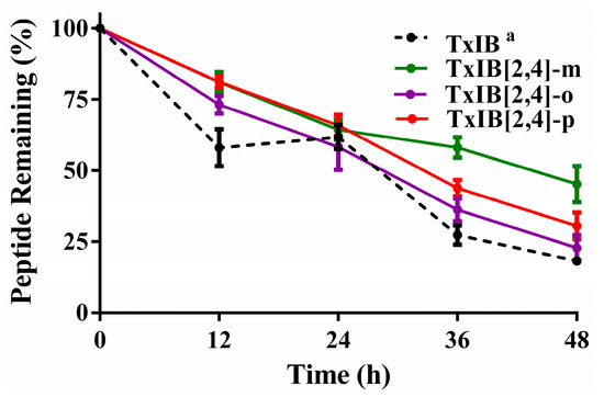 The peptides were incubated in human serum at 37 °C to test their stability. As shown in Figure 6, the stability of the analogs was improved compared with the native TxIB. Among the three active analogs, TxIB[2,4]-m is the most stable one, followed by the TxIB[2,4]-p and TxIB[2,4]-o. The results indicated that the modification on the disulfide bond increased the serum metabolic stability slightly, as (45.2 ± 6.3)% TxIB[2,4]-m remained after 48 h. Based on these data, the circulating half-lives of TxIB and the xylene analogs may be governed by renal and tissue clearance, rather than their intrinsic stability in the circulation.