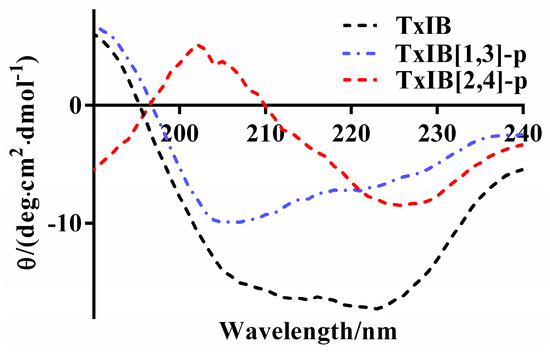 CD spectroscopy was used to study the conformational changes between native TxIB and its analogs TxIB[1,3]-p and TxIB[2,4]-p. The absorption spectra of TxIB[1,3]-p and TxIB[2,4]-p were different from native TxIB. The negative ellipticities at 208 nm (λ) and 222 nm (λ) of TxIB showed the existence of α-helix. Meanwhile, the positive Cotton effect and negative Cotton effect at 205 nm of TxIB[1,3]-p and TxIB[2,4]-p indicated the different types of β-turn (Figure 7).