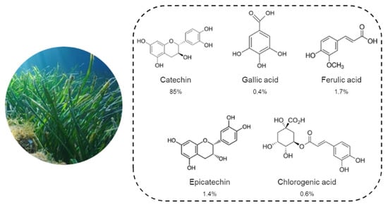 Recently, the hydroalcoholic extract from P. oceanica leaves, called POE, has been the focus of a series of bioactivity studies. A first UPLC characterization analysis, conducted by some of our authors [5], showed that the hydrophilic fraction of POE consisted of 88% phenolic compounds. The polyphenolic profile was specifically represented by about 85% (+) catechins, while the remaining 5% by a mixture of gallic acid (0.4%), ferulic acid (1.7%), epicatechin (1.4%) and chlorogenic acid (0.6%). The small remaining fraction (11%) was represented by minor peaks, indicating the presence of further compounds, which, although detectable as phenols, are un-known/uncharacterized (Figure 1) [5].