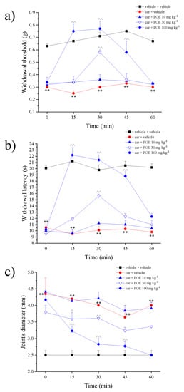 POE effects against carrageenan-induced pain and paw oedema. Two hours after the intraplantar injection of carrageenan (car), POE was per os administered. Pain threshold was measured by (a) von Frey test and (b) paw pressure test over time; (c) at the same time points, oedema was evaluated by measuring the joint’s diameter. Results are reported as mean ± S.E.M. of 10 mice analyzed in 2 different experimental sessions. ** p < 0.01 vs. vehicle + vehicle; ^^ p < 0.01 vs. car + vehicle.