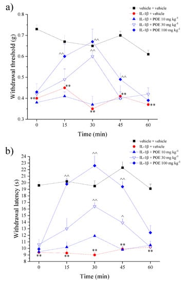 POE effects against IL-1β-induced pain. IL-1β was intraplantarly injected; 2 h later, POE was per os administered. Pain threshold was measured by (a) von Frey test and (b) paw pressure test over time. Results are reported as mean ± S.E.M. of 10 mice analyzed in 2 different experimental sessions. ** p < 0.01 vs. vehicle + vehicle; ^ p < 0.05 and ^^ p < 0.01 vs. IL-1β + vehicle.