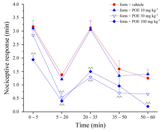 POE effects against formalin-induced pain. Formalin (form) was intraplantarly injected on time 0; in the following 60 min, the time spent lifting, favoring, licking, shaking and flinching the injected paw was recorded as nocifensive behavior. POE was p.o. administered 20 min before formalin. Control animals (vehicle + vehicle) showed 0 min as nociceptive response. Results are reported as mean ± S.E.M. of 10 mice analyzed in 2 different experimental sessions. ^^ p < 0.01 vs. form + vehicle.