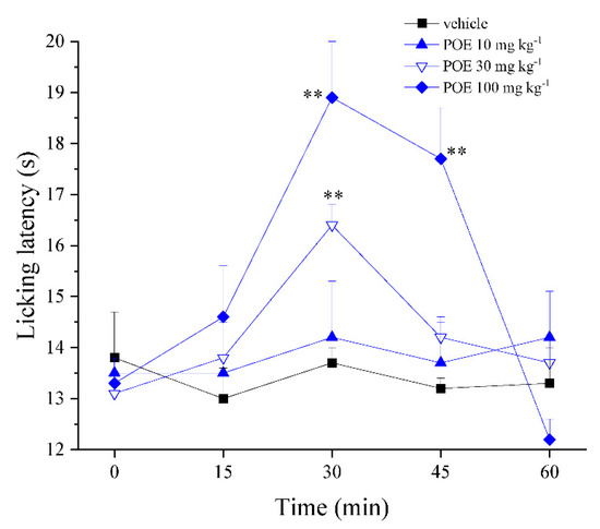 Based on the interesting findings collected in the hypersensitivity models mentioned above, the analgesic properties of POE were also explored in naïve animals characterized by a physiological pain threshold. Through the hot-plate test (Figure 5), it was found that POE (30 and 100 mg kg−1) was able to increase the physiological pain threshold evaluated as a response to a hot stimulus.