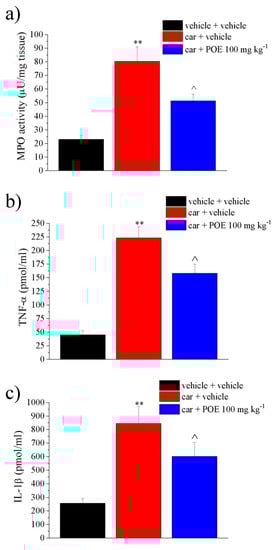 As illustrated in Figure 6a, carrageenan induced an increase in the tissue MPO activity at 80.3 ± 10.7 µU/mg compared to 23 ± 2.9 µU/mg of the vehicle; POE showed a significant inhibitory effect on the MPO activity by 50%. This result showed that POE was able to control pain in parallel with a significant decrease in tissue damage parameters.