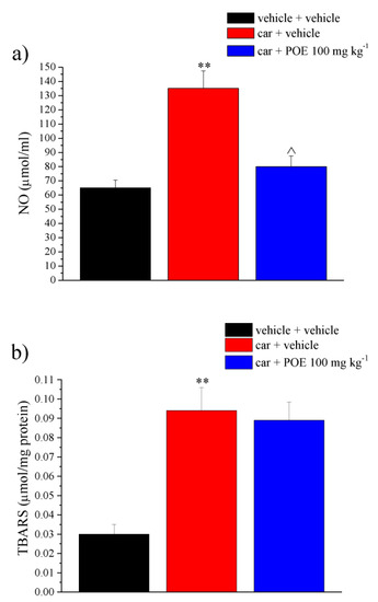 Ex vivo analysis of antioxidant POE effects. Paw damage was induced by carrageenan (car, i.pl.); 2 h after car injection, POE was p.o. administered against carrageenan-induced pain and paw oedema. Two hours after the intraplantar injection of carrageenan (car), POE was per os administered. Thirty min later, paw tissue was collected for dosing (a) NO levels were evaluated via nitrite and nitrate measurement according to the Griess reaction; (b) the peroxidation of lipids was quantified by the thiobarbituric-acid-reactive substances (TBARS) assay. Results are reported as mean ± S.E.M. of 10 mice analyzed in 2 different experimental sessions. ** p < 0.01 vs. vehicle + vehicle; ^ p < 0.05 vs. car + vehicle.