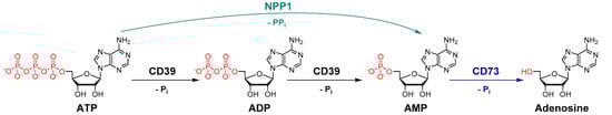 Hydrolysis of ATP to adenosine catalyzed by the key ectonucleotidases NPP1, CD39 and CD73 (Pi, inorganic phosphate).