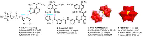 So far, only moderately potent and/or non-selective NPP1 and CD39 inhibitors have been described, which can be divided into nucleotides and non-nucleotides. N6-Diethyl-β,γ-dibromomethylene-ATP (ARL 67156, 1) is a weak dual CD39/CD73 inhibitor with low metabolic stability [16,17]. Several other negatively charged compound classes including (poly)sulfonates such as suramin (2) and sulfoanthraquinones [18,19,20], and polyoxometalates (POMs), e.g., [TiW11CoO40]8− (3) and [Co4(H2O)2(PW9O34)2]10− (4) [21,22], were found to inhibit CD39 and/or NPP1. A selection of the most potent NPP1 and CD39 inhibitors is depicted in Figure 2.