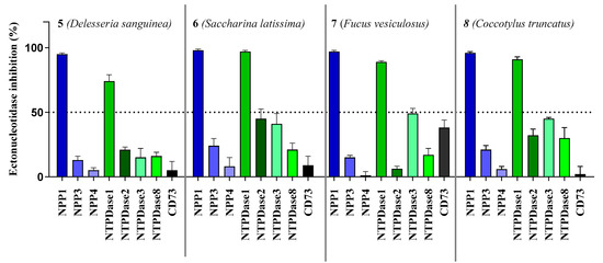 Four sulfated polysaccharides 5–8 (Table 1), extracted from different algae species, were investigated in the present study as potential inhibitors of ectonucleotidases. Compounds 5 and 8 represent sulfated xylogalactans from red algae, compounds 6 and 7 are brown algae-derived fucoidans. They were extracted, purified and chemically characterized as previously described [32,33,34]. The chemical characteristics of the used batches are shown in Table 1 and Table 2.