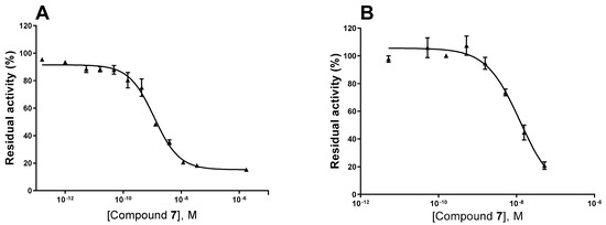 Concentration–inhibition curves of compound 7 at human NPP1 (A) and human CD39 (B). For details see Experimental Section.