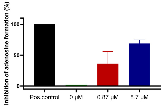 Blockade of extracellular adenosine formation from ATP by compound 7 on human U87 glioblastoma cells. The cells were treated with ATP (ectonucleotidase substrate) and incubated for 3 h in the presence of dipyridamole to prevent cellular uptake of adenosine, and EHNA to prevent adenosine deamination. Adenosine was quantified by CE-UV. Results represent means of two independent experiments each performed in quadruplicate measurements. Positive (Pos.) control: the potent NPP1 inhibitor PSB-POM141 (4, 10 µM) or the potent CD73 inhibitor PSB-19316 (0.1 µM) were added both of which led to a full blockade of NPP1 and CD73 activity thereby preventing the formation of adenosine. For details see Experimental Section 3.6.