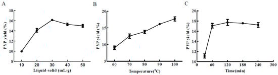 Single-factor experiment analysis of the porphyran (PYP) yield. (A) Liquid–solid ratio; (B) temperature; (C) time.