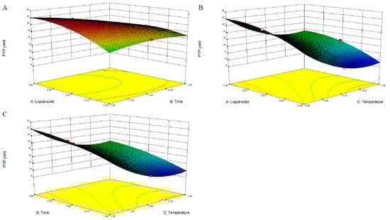 3-D response surface plots of the effects of the various parameters on the PYP yield. (A) Liquid–solid ratio and time; (B) liquid–solid ratio and temperature; (C) time and temperature.