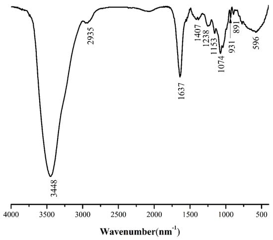 The characteristics of PPYP were examined by Fourier transform infrared (FT-IR) spectrometer (Figure 3). The peaks at 3448, 2935, and 1637 cm−1 presented the stretching vibrations of hydroxyl, alkyl, and carboxyl groups [31], respectively. The stretching vibration of S=O exhibited a peak near 1240 cm−1 which was characterized by the presence of sulfate groups [32]. The characteristic absorption peak of the ether bond (-C-O-C-) was observed at 931 cm−1, indicating that PPYP contains 3,6-anhydro-α-l-galactose [33], which is consistent with the physicochemical property of PPYP. The peak at 1000–1200 cm−1, 500–800 cm−1, and 891 cm−1 confirmed that PPYP existed in the pyran structure with a β-type glycosidic bond. PPYP also showed a peak of Gal at 1074 cm−1 [34,35,36,37]. The FT-IR spectra illustrated that PYPP might be a β-type sulfated galactan-pyranose.