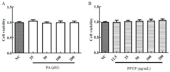 HepG2 cells were treated in different concentrations of PPYP or PA for 48 h. When the cells were treated with PA at the concentrations ranging from 25 to 200 μM, no cytotoxicity toward HepG2 cells was observed compared with that in the normal control (NC) group (Figure 4A). As shown in Figure 4B, PPYP had no effect on cell viability in the concentration range 12.5–200 μg/mL. Therefore, the concentrations of PA up to 200 μM and PPYP at 200 μg/mL were chosen for the following experiments.